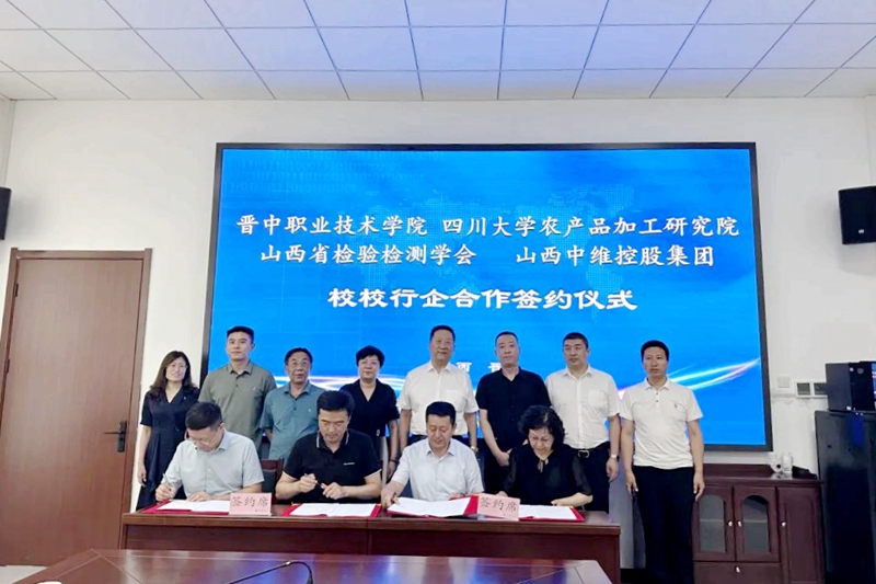 2023年8月18日,晉中職業(yè)技術(shù)學(xué)院、四川大學(xué)農(nóng)產(chǎn)品加工研究院、山西省檢驗檢測學(xué)會、中維控股集團“校校行企”合作洽談會議暨共建“食品產(chǎn)業(yè)學(xué)院”合作簽約儀式在晉中職業(yè)技術(shù)學(xué)院行政樓舉行。晉中職業(yè)技術(shù)學(xué)院院長雒衛(wèi)廷、四川大學(xué)農(nóng)產(chǎn)品加工研究院常務(wù)副院長趙志峰、山西省檢驗檢測學(xué)會副會長張紅、中維控股集團董事長郭秀忠等領(lǐng)導(dǎo)出席,與會的還有各單位相關(guān)負責(zé)同志。